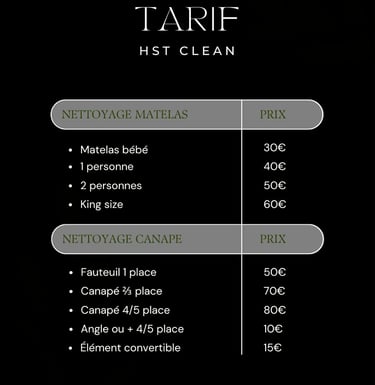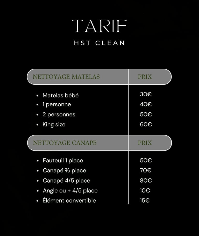Hst Clean propose un nettoyage professionnel de canapé, nettoyage de matelas et nettoyage de tapis pour éliminer taches, acariens, odeurs et saletés incrustées. Grâce à notre matériel spécialisé, nous nettoyons en profondeur pour redonner hygiène, fraîcheur et confort à vos textiles. Un service rapide, efficace et adapté aux particuliers comme aux professionnels.