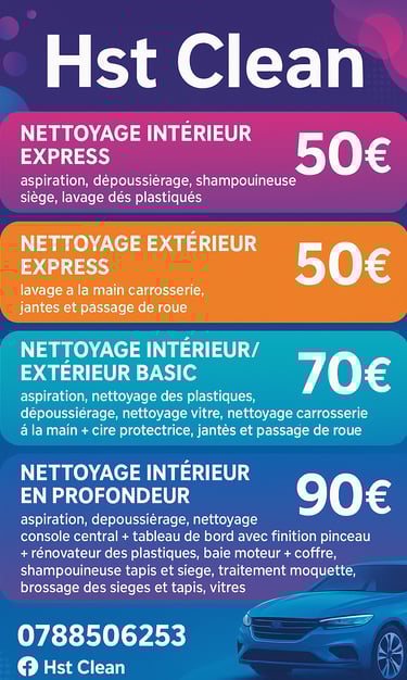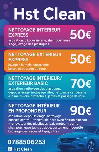 Profitez d’un nettoyage complet pour votre voiture ou moto : intérieur impeccable, sièges et tissus détachés, aspiration, plastiques soignés, et extérieur brillant (carrosserie, jantes, vitres).
