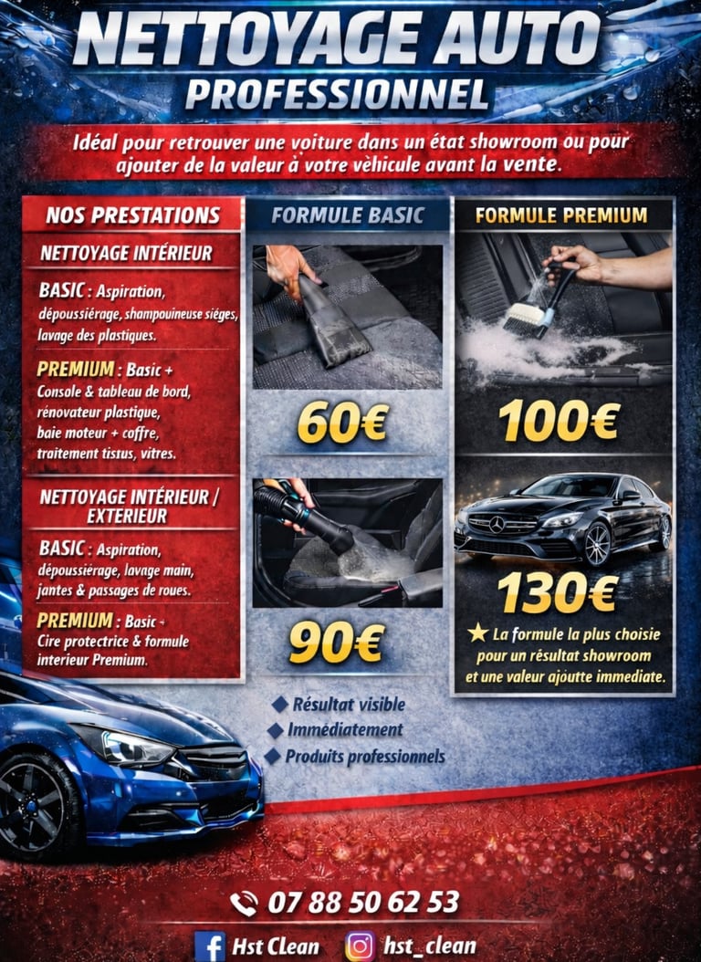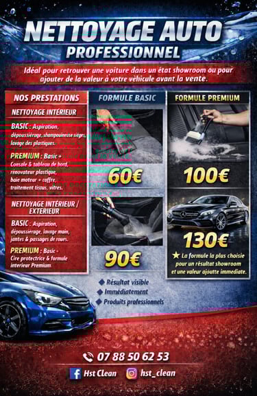 Profitez d’un nettoyage complet pour votre voiture ou moto : intérieur impeccable, sièges et tissus détachés, aspiration, plastiques soignés, et extérieur brillant (carrosserie, jantes, vitres).