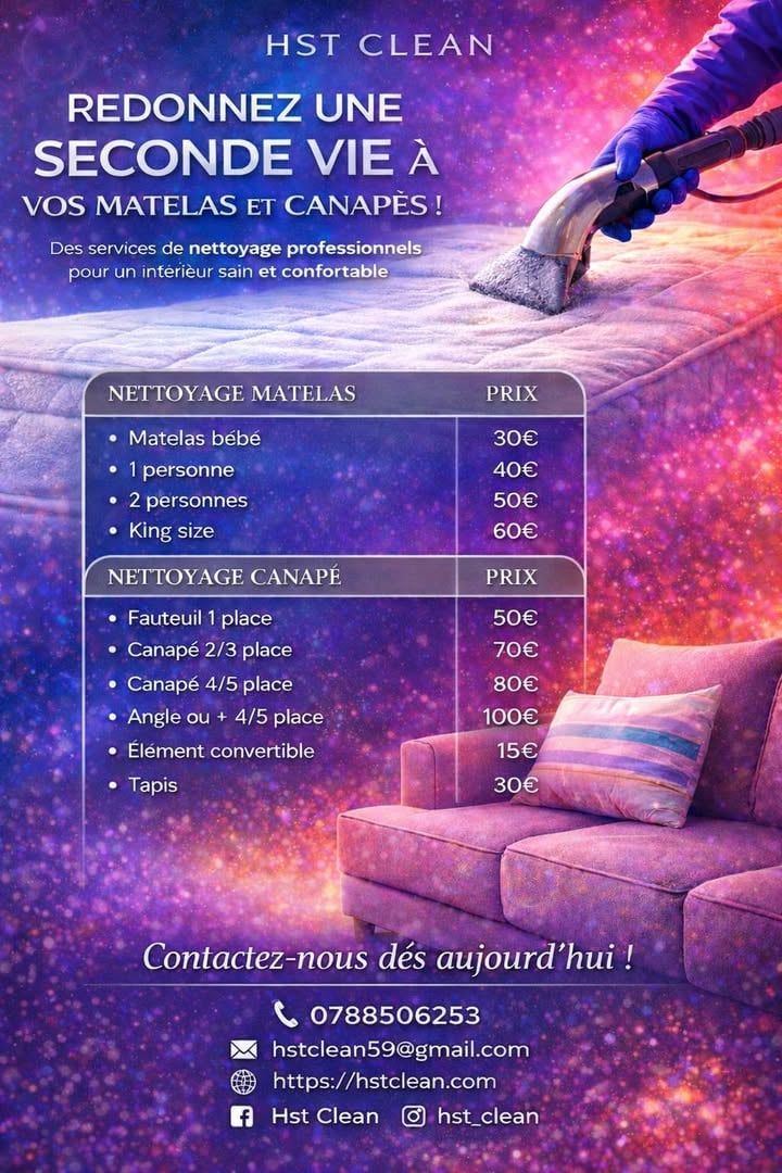 Hst Clean propose un nettoyage professionnel de canapé, nettoyage de matelas et nettoyage de tapis pour éliminer taches, acariens, odeurs et saletés incrustées. Grâce à notre matériel spécialisé, nous nettoyons en profondeur pour redonner hygiène, fraîcheur et confort à vos textiles. Un service rapide, efficace et adapté aux particuliers comme aux professionnels.